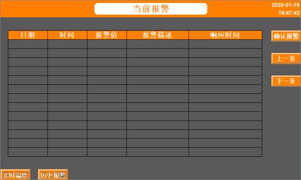 進入“當前報警”界面,顯示的是當前告警發(fā)生情況,如圖3.4;若要查看所有歷史告警,進入“歷史報警”界面。在“當前報警”界面查看實時發(fā)生的報警,有報警時,此界面顯示出報警提示,并且蜂鳴器鳴叫,在蜂鳴器鳴叫時,點擊確認報警,蜂鳴器會停止鳴叫,同時報警提示的字顏色會變?yōu)樗{色,當報警故障接解除后,報警提示會消失。