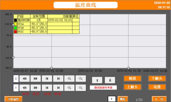 進入“溫度曲線”界面,每一個頁面存有12條曲線,共20頁。每5分鐘記錄一次溫度,可以存儲300天。具體曲線要求可在屏上自行調(diào)節(jié)。