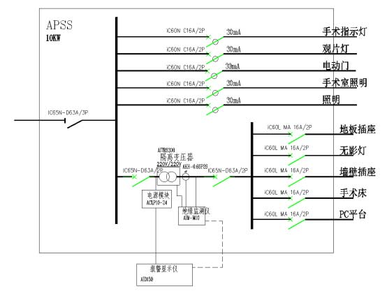 根據GB16895.24-2005所規定,二類場所內,隔離電源系統應用于維持生命的、外科Operating的和其他位于“患者區域”內電氣設備和供電回路。故本次項目中重癥監護室和搶救室的重要負載應由隔離電源來進行供電。同時使用絕緣監測裝置對系統的對地絕緣情況進行實時監控。