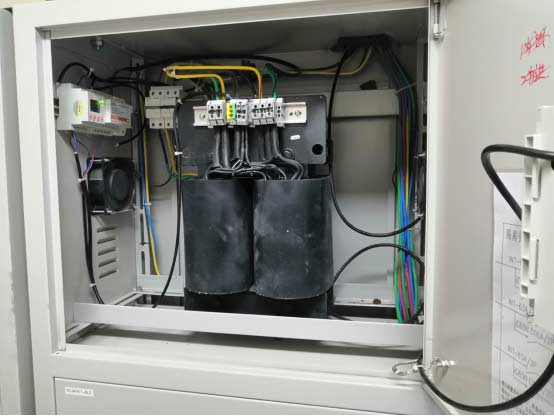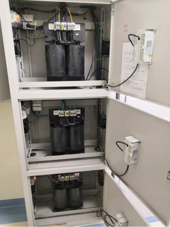 三層ICU和四層NICU各裝有兩臺隔離電源柜,每臺配電柜內裝有三套系統,配電柜明裝于UPS機房,報警顯示儀安裝于柜門。