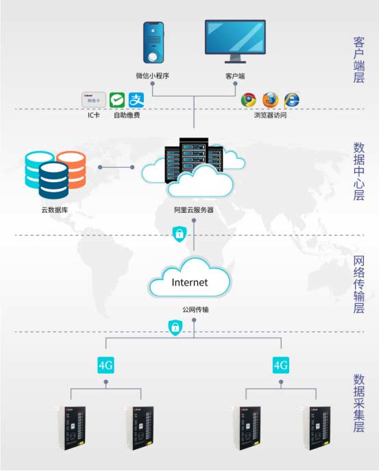 各級政府部門高度重視電瓶車充電引發火災的危害,GB51348-2019《民用建筑電氣設計標準》中也規定了儲備倉庫、電動車充電等場所的末端回路應設置限流式電氣防火保護器。AcrelCloud-9500電瓶車充電樁收費平臺將現場的離散電瓶車充電樁接入平臺,進行集中管理,降低管理難度,方便用戶運維,同時通過充電樁本身的安全監控與保護,結合限流式保護器,能夠及時合理的杜絕充電過程中存在的火災隱患,讓充電更有保障、更放心,能夠切實保障人民群眾的生命財產安全。