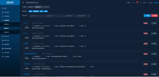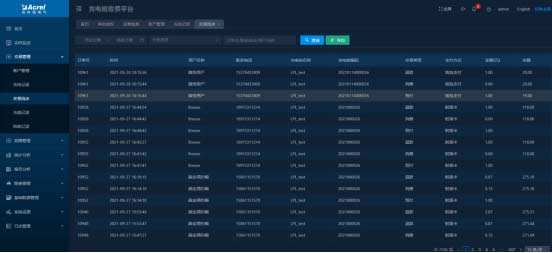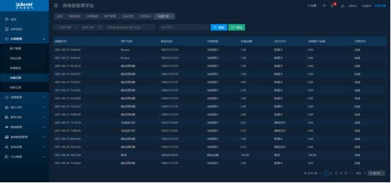 顯示所有訂單數據,可以對訂單按照充電站、充電樁、支付方式、交易狀態等進行分類查詢,可對充電中的充電樁進行停止充電操作。