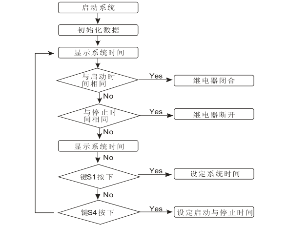 系統時間以及開啟與關閉時間的設定,系統時間與開啟或關閉時間相同時繼電器、蜂鳴器和指示燈工作狀態的管控。系統程序流程如圖4所示。