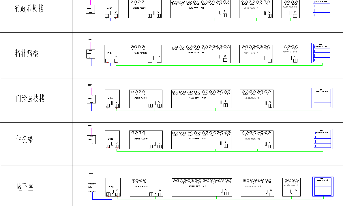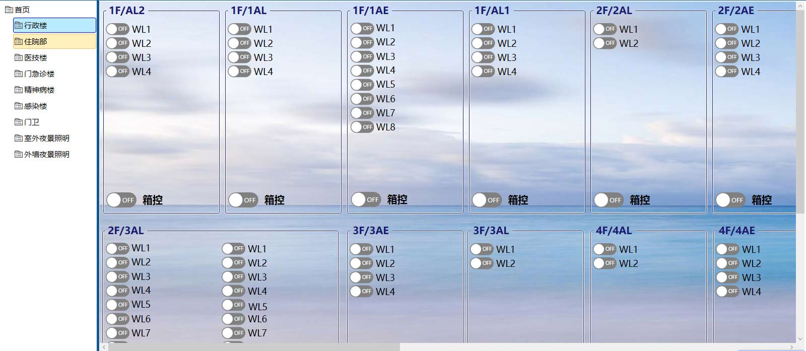 門診樓、住院樓、精神病樓、感染樓、行政樓樓、室外夜景照明等采用6條支線(KNX總線線纜BUS EIB2*2*0.8)到消防控制值班室,通過IP網關接入到醫院內網交換機,實時數據上傳到Acrel-iLightControl(智能照明控制系統)。