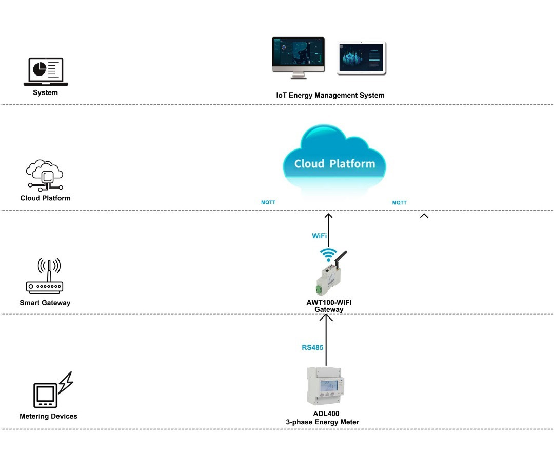 Cloud Hosting Service Solution: Considering about the comprehensive cost of renting the cloud server and the amount of monitoring circuits, deployment of cloud IoT Energy Management System should be paired with hosting service. In this situation, customer don’t need to afford the rent of cloud server and will use our own cloud server. Also, for the hardware of this solution, no change need be done just like in the pilot project solution structure. Customer only need to order more ADL400 3-phase energy meter and maybe paired AWT100-WiFi gateway according to the number of subsequent request.