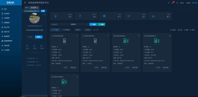 展示當前充電站各充電樁的狀態及實時充電數據,統計站點和各充電樁今日充電數據,支持充電單價、設備重啟、充電/報警/保護等參數的遠程批量下發,其中對于遠程參數設置進行了權限控制,未授權的用戶不可操作,確保現場設備正常運行。