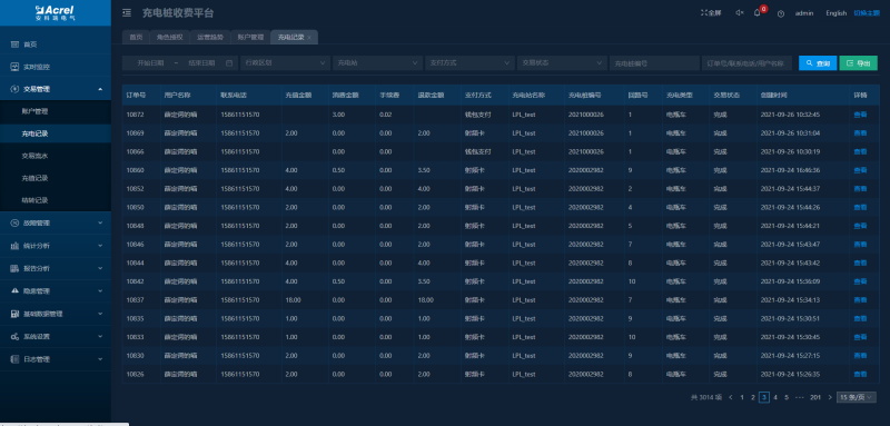 顯示所有訂單數據,可以對訂單按照充電站、充電樁、支付方式、交易狀態等進行分類查詢,可對充電中的充電樁進行停止充電操作。