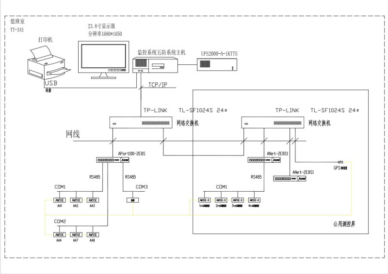在10kV開關(guān)室內(nèi)配置通訊管理機1臺,實現(xiàn)10kV開關(guān)柜微機保護裝置的數(shù)據(jù)采集;在電氣監(jiān)控室的通訊屏上配置通訊管理機1臺,實現(xiàn)10kV開關(guān)柜微機保護裝置、測控裝置、直流屏以及其它智能設(shè)備的數(shù)據(jù)采集。在電氣監(jiān)控室配置監(jiān)控系統(tǒng)和微機五防系統(tǒng)主機1臺、用于實現(xiàn)變電站的遙測、遙信、遙控、報警、報表、操作票、防誤操作等相關(guān)功能。監(jiān)控系統(tǒng)按照單網(wǎng)組網(wǎng)方式,實現(xiàn)變電站內(nèi)數(shù)據(jù)采集與實時監(jiān)控。系統(tǒng)組網(wǎng)拓撲圖如下: