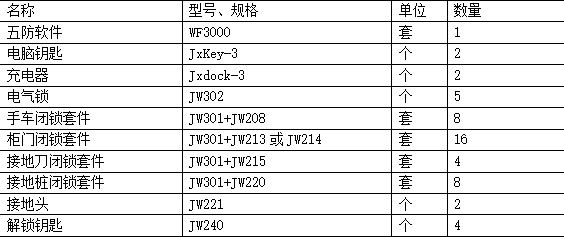 針對10kV開關(guān)柜,每臺斷路器配置五防電氣鎖1把,每個手車(包含斷路器手車、PT手車、隔離手車)配置手車閉鎖套件1套,按手車數(shù)量的2倍配置柜內(nèi)閉鎖套件,每個接地刀與隔離刀配置接地刀閉鎖套件1套,配置接地頭(按柜子數(shù)量的一半配置)。五防解鎖鑰匙4把、充電器2個、電腦鑰匙2把、微機五防軟件一套。