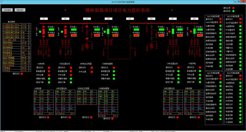 Acrel-2000電力監(jiān)控系統(tǒng)可以直觀顯示一次系統(tǒng)圖,并實時顯示10kV電壓等級各回路的遙測量、遙信量和報警信號等。遙測量包括電壓、電流、功率、功率、電能等電參量等;遙信量包括中壓開關(guān)柜內(nèi)路斷路器、手車、隔離開關(guān)、負荷開關(guān)、地刀開關(guān)的分合狀態(tài)、斷路器彈簧儲能狀態(tài)及遠方就地控制狀態(tài);報警信號包括微機保護裝置的告警信號、保護跳閘信號及裝置異常信號。