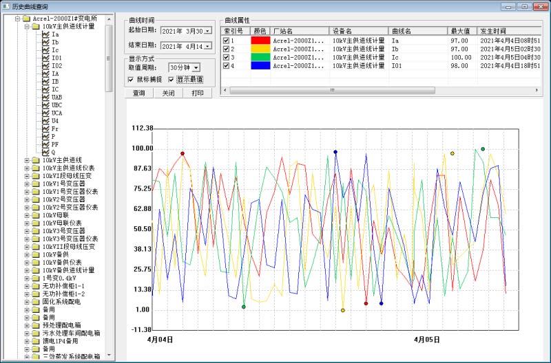 Acrel-2000電力監(jiān)控系統(tǒng)在曲線查詢界面,可以直接查看各電參量曲線,包括三相電流、三相電壓、有功功率、無功功率、功率因數(shù)、溫度等曲線。并統(tǒng)計該曲線查詢范圍內(nèi)發(fā)生時間、平均值等。
