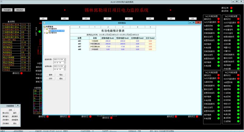 Acrel-2000電力監(jiān)控系統(tǒng)可以查詢各回路或設(shè)備指定時間的運行參數(shù),報表中顯示電參量信息應(yīng)包括:各相電流、三相電壓、總功率因數(shù)、總有功功率、總無功功率、正向有功電能、溫度值等。可以按照日、月、年的格式進行查詢、導(dǎo)出、打印。