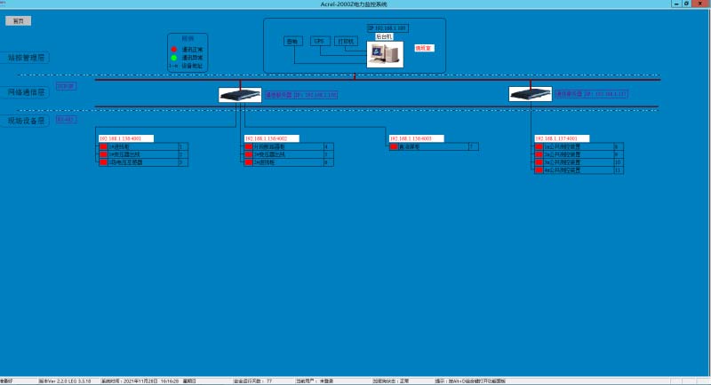Acrel-2000電力監(jiān)控系統(tǒng)支持實時監(jiān)視接入系統(tǒng)的各設(shè)備的通信狀態(tài),能夠完整的顯示整個系統(tǒng)網(wǎng)絡(luò)結(jié)構(gòu);可在線診斷設(shè)備通信狀態(tài),發(fā)生網(wǎng)絡(luò)異常時能自動在界面上顯示故障設(shè)備或元件及其故障部位。