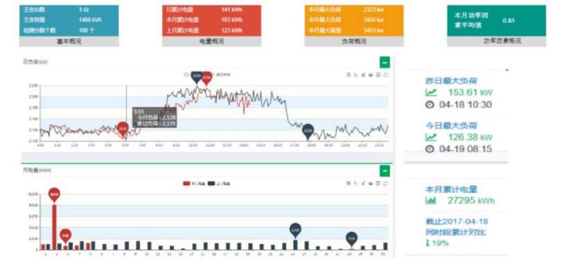 平臺首頁可顯示:主變臺數、主變容量、監測分路個數;當日累計電量、本月累計電量、上月總電 量;負荷概況:本月負荷、本年負荷、本月需量負荷;月度功率因素、用電異常預警事件數; 界面中部顯示昨日和今日的日負荷曲線。