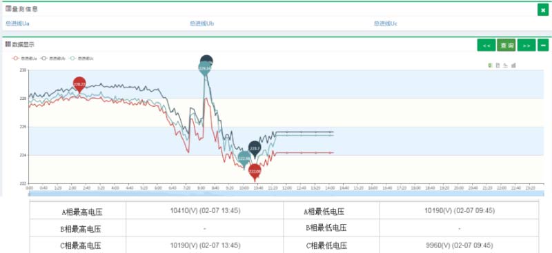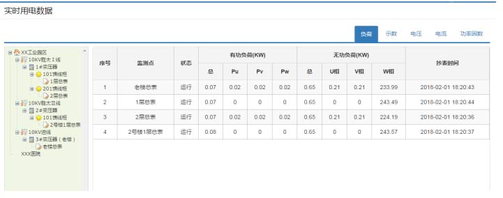 同時也可以查看分路實時用電數據,提供負荷、示數、電壓、電流、功率因數等主要用電數據的統計和曲線圖形。