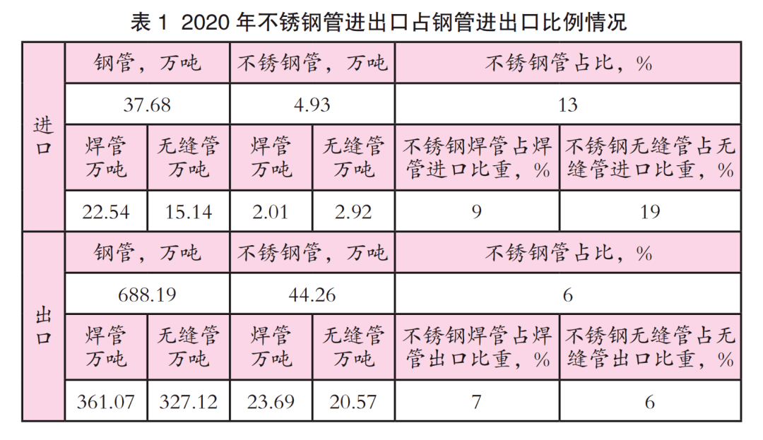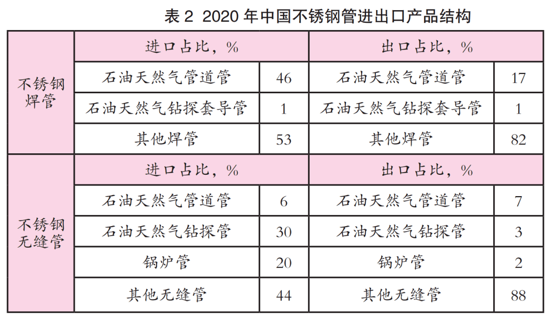 中國不銹鋼管進出口價格相差較大,說明目前國內一些不銹鋼管下游領域使用的高端產品仍有部分需要進口,如不銹鋼油井管、高壓鍋爐管、核電蒸汽發生器用管等,而出口的不銹鋼管則以中低端產品為主。2020年中國不銹鋼管進出口產品結構如表2所示。