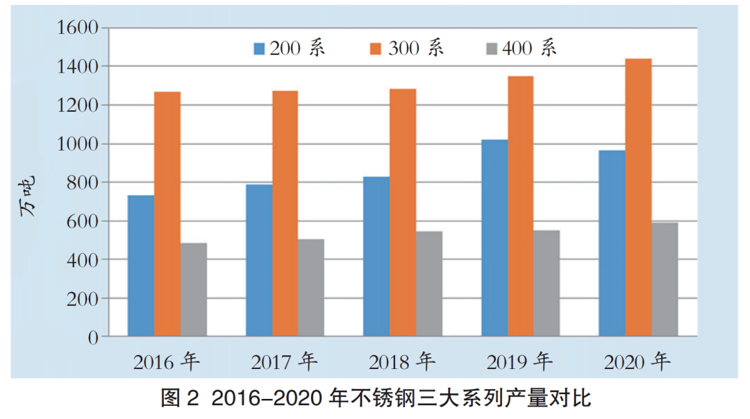 2020年中國不銹鋼表觀消費量為2560.79萬噸,同比增加155.46萬噸,增長6.46%。2016-2020年中國不銹鋼產量和表觀消費量走勢如圖1所示。2016-2020年三大系列不銹鋼產量對比如圖2所示。