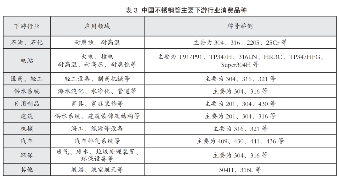 隨著中國石油化工、核電、海水淡化、污水處理、垃圾處理、海洋工程等領域的發展,對不銹鋼管質量要求和數量需求會越來越高。中國不銹鋼管行業要瞄準國際市場,進一步強化基礎研究,提高產品的穩定性、耐久性,引領原創成果的突破,拓展為國家重大項目的服務領域,實現向技術創新、綠色化、智能化先進制造產業的轉型。中國不銹鋼管主要下游行業消費品種如表3所示。