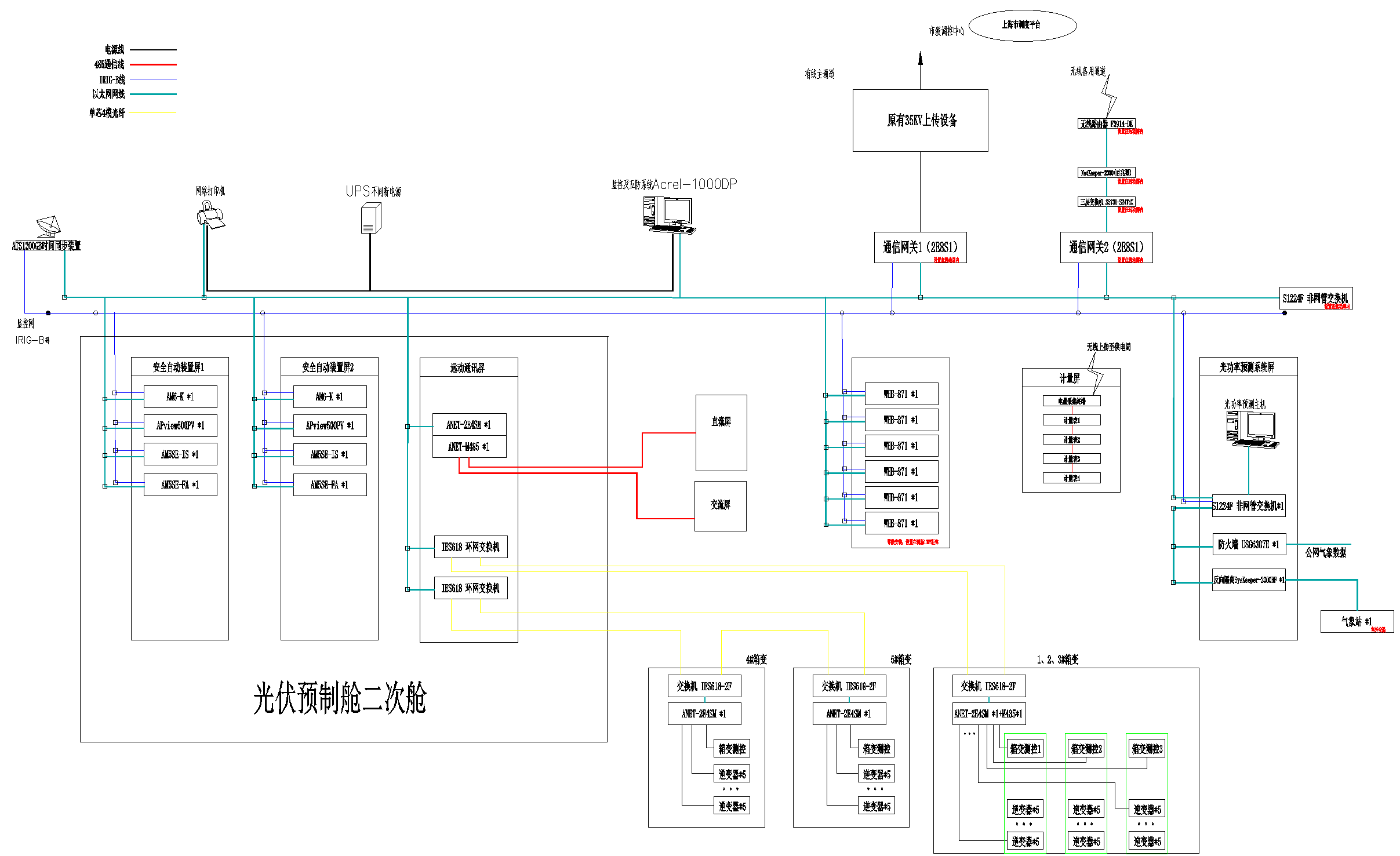 光伏電站中5臺箱變之間通過光纖環網,保證數據長距離的穩定傳輸,通過通信管理機及網絡交換機實時采集微機保護裝置、電能質量在線監測裝置、計量、遠動系統等二次設備數據,實現光伏發電系統監控與自動化管理;同時,配置對時裝置、遠動裝置滿足系統與上級調度的需求,配置一套一體化電源系統,為二次設備及監控主機等重要設備運行提供穩定可靠的電源,實現整個光伏系統的安全、穩定運行。