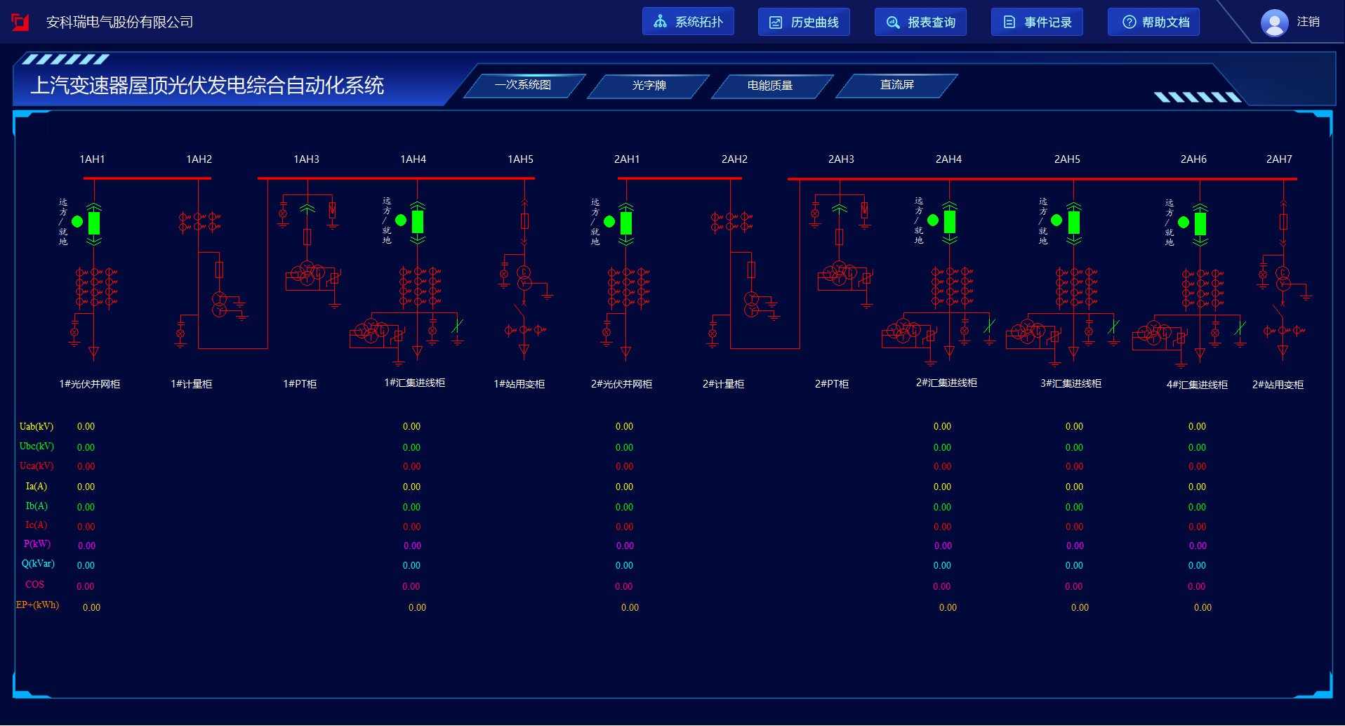 系統主接線圖為光伏電站內新建的10kV開閉所一次系統圖,人機界面可以實時顯示采集到的各類數據,包括開關柜的電壓、電流和功率等關鍵參數,以及開關柜內斷路器、手車的分合狀態等。