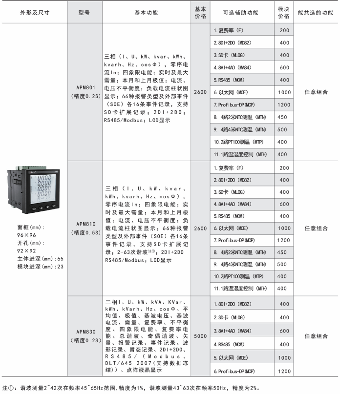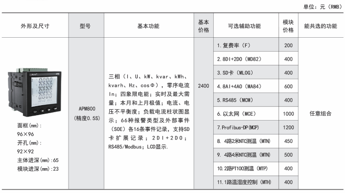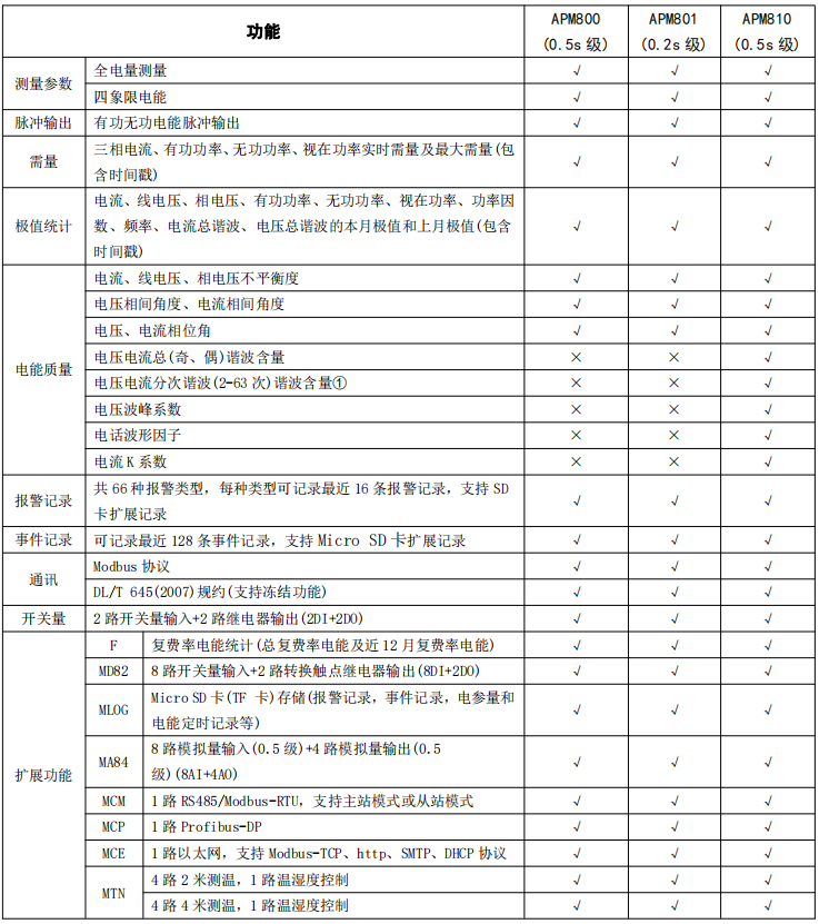 APM系列網(wǎng)絡(luò)電力儀表按IEC標準設(shè)計,具有全電量測量,電能統(tǒng)計,電能質(zhì)量分析及網(wǎng)絡(luò)通訊等功能,主要用于對電網(wǎng)供電質(zhì)量的綜合監(jiān)控診斷及電能管理。該系列儀表采用了模塊化設(shè)計,當客戶需要增加開關(guān)量輸入輸出,模擬量輸入輸出,SD卡記錄,以太網(wǎng)通訊時,只需在背部插入對應(yīng)模塊即可。