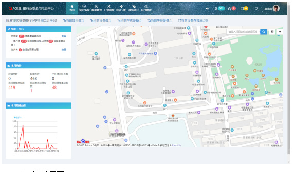 平臺(tái)首頁(yè)能顯示用戶所管轄的場(chǎng)所及對(duì)應(yīng)的概況信息。包括場(chǎng)所的個(gè)數(shù),安裝設(shè)備的數(shù)量及情況,報(bào)警的數(shù)目等。針對(duì)各個(gè)場(chǎng)所,顯示具體的地圖位置,方便用戶進(jìn)行查看和巡查。
