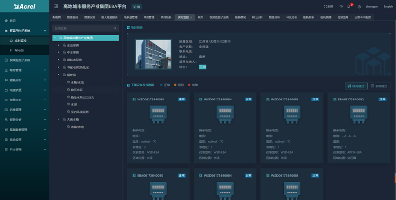 主要展示的內容有:項目概況、設備狀態、設備分類、設備報警信息、報警分類、報警統計、設備臺賬信息等。其中百度地圖可以選配成BIM建筑模型,任何傳感器報警時可以在BIM模型中預警顯示。