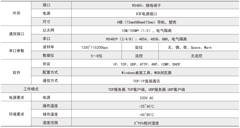 ● 2 路 10-100Mbits 自適應以太網通信,實現 8 路服務器功能,支持 Web 網頁參數配置。